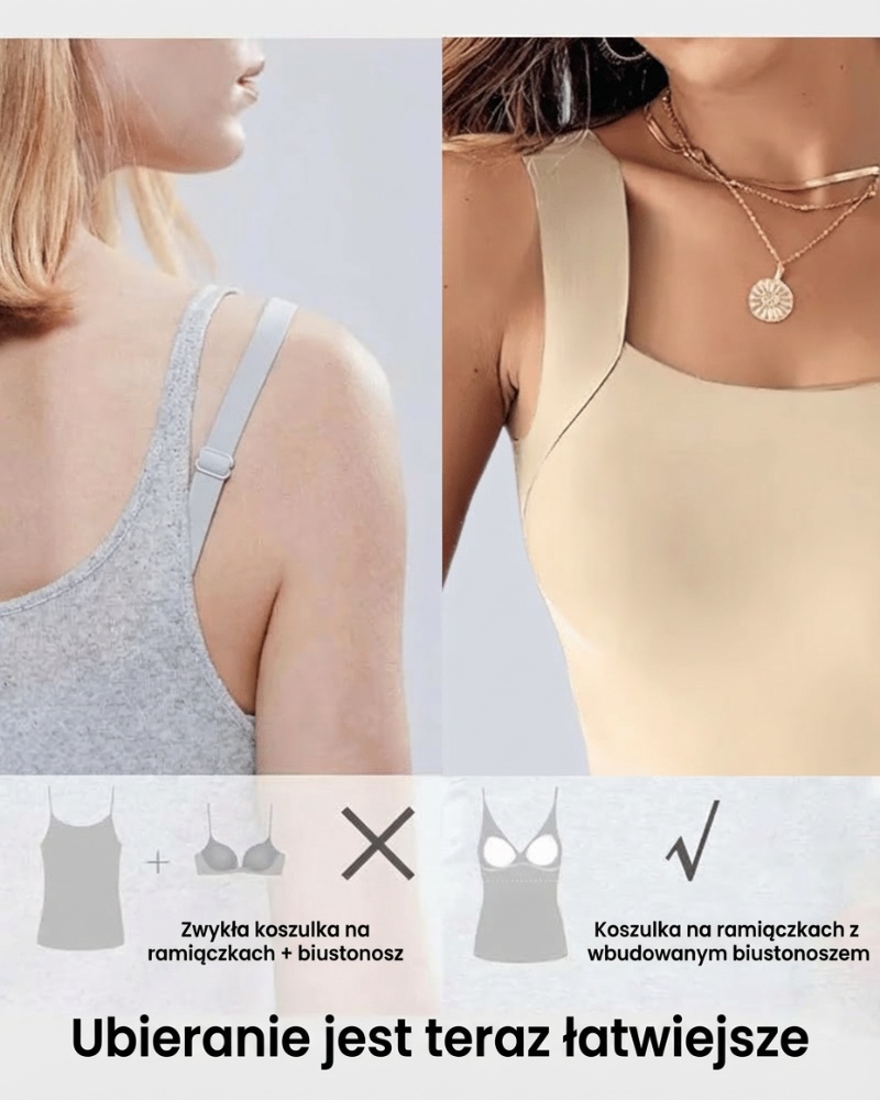 Koszulka z wbudowanym biustonoszem i dekoltem w kształcie litery U sprawia, że każdego dnia czujesz się podtrzymana, pewna siebie i komfortowo bez biustonosza!
